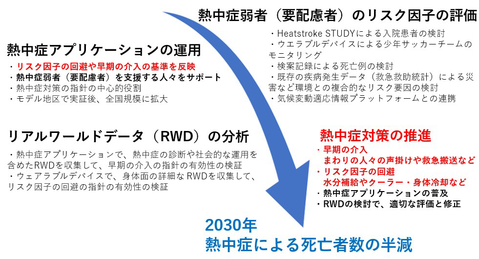本研究の目標は、2030年までに「熱中症弱者(要配慮者)」とその支援者を支える熱中症予防アプリケーションを社会実装し、熱中症による死亡者数を半減させることである。そのために、臨床・疫学・工学・社会実装を統合した多層的なアプローチを展開する。