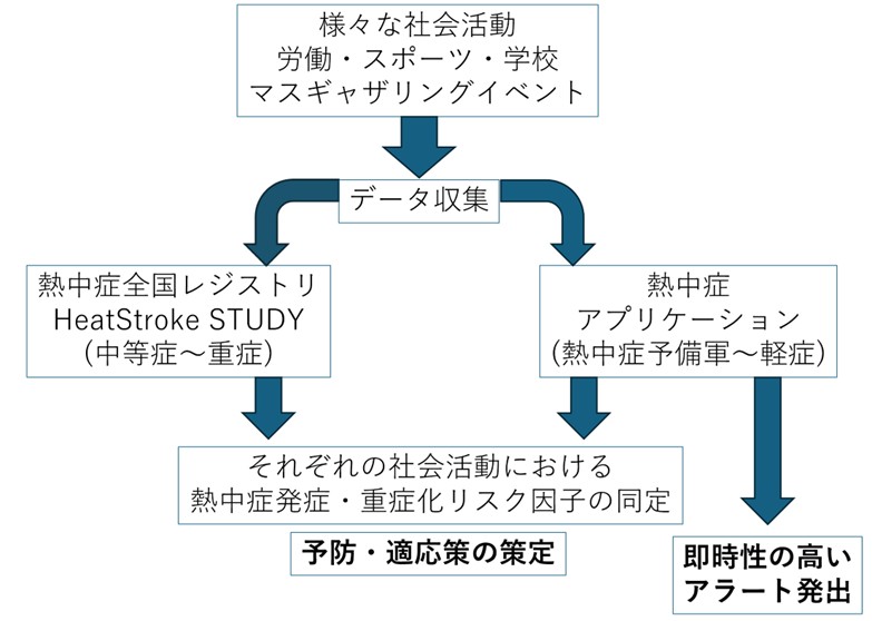 しかし、現在我が国の熱中症の発生統計は総務省発表による救急搬送者数などに依存しているため即時性の高い発生者数の把握は難しい。また現状では暑熱環境と個々の患者の熱中症発症から重症化に至る影響を評価することも困難である。