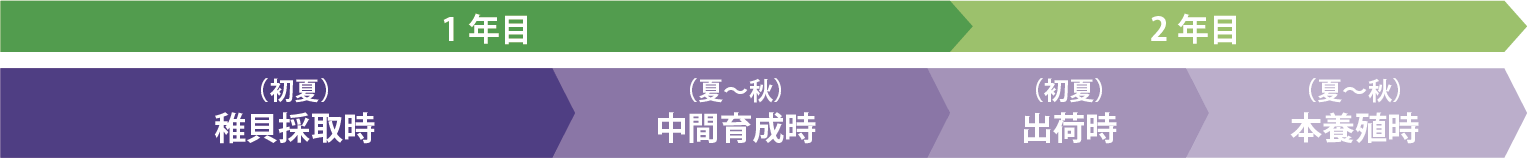早めの稚貝採取でケガのない、体力のある稚貝を作る。②水温の目安