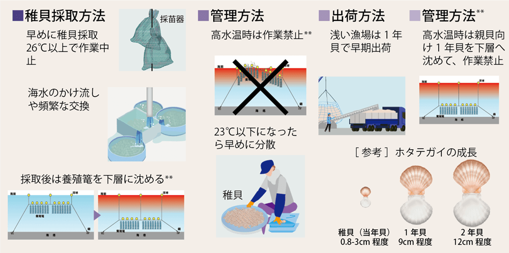 RCP8.5シナリオでは、今世紀末に水深27m以浅での高いへい死率により養殖不適となる地点が多いという予測もある。へい死率が低い水深30m以深の養殖適地は限られることから、特にホタテガイ養殖への依存度が高い地域で社会・経済への影響が大きくなる可能性があるため、養殖区域の沖への拡充、親貝管理と種苗供給システムの構築、高温耐性品種の作出・導入、代替の漁業・養殖業への切り替えなどの対策が必要である。また、温暖化に伴う海洋酸性化による影響への対策も必要である。