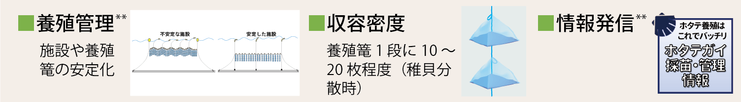 波浪や流れによる貝同士のぶつかり合いや養殖篭等への擦れでホタテガイがケガをすると死にやすくなるため、養殖施設や養殖篭を安定させる。