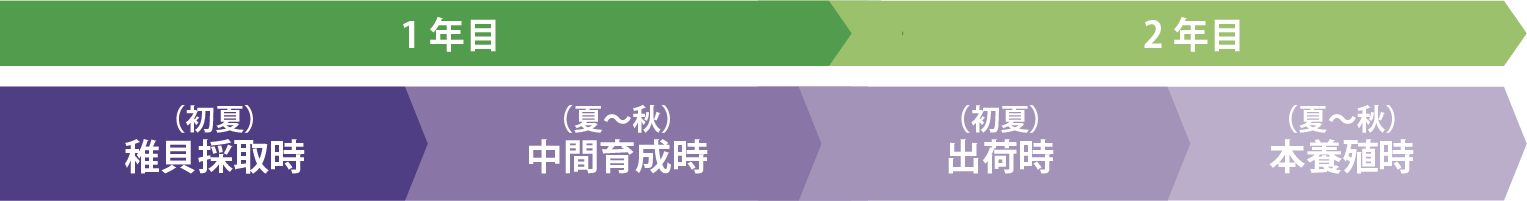 垂下式養殖*において、短期的には稚貝採取・中間育成・出荷・本養殖の各ステージで、養殖技術の改善等により対応する。中長期的対策として新たな技術開発や高付加価値化を検討する。