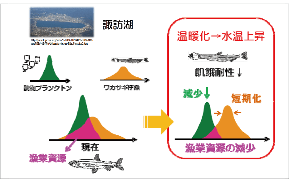 現在、水温上昇によると推測されるアユの漁獲量の減少や、ワカサギのへい死が報告されている地域がある。