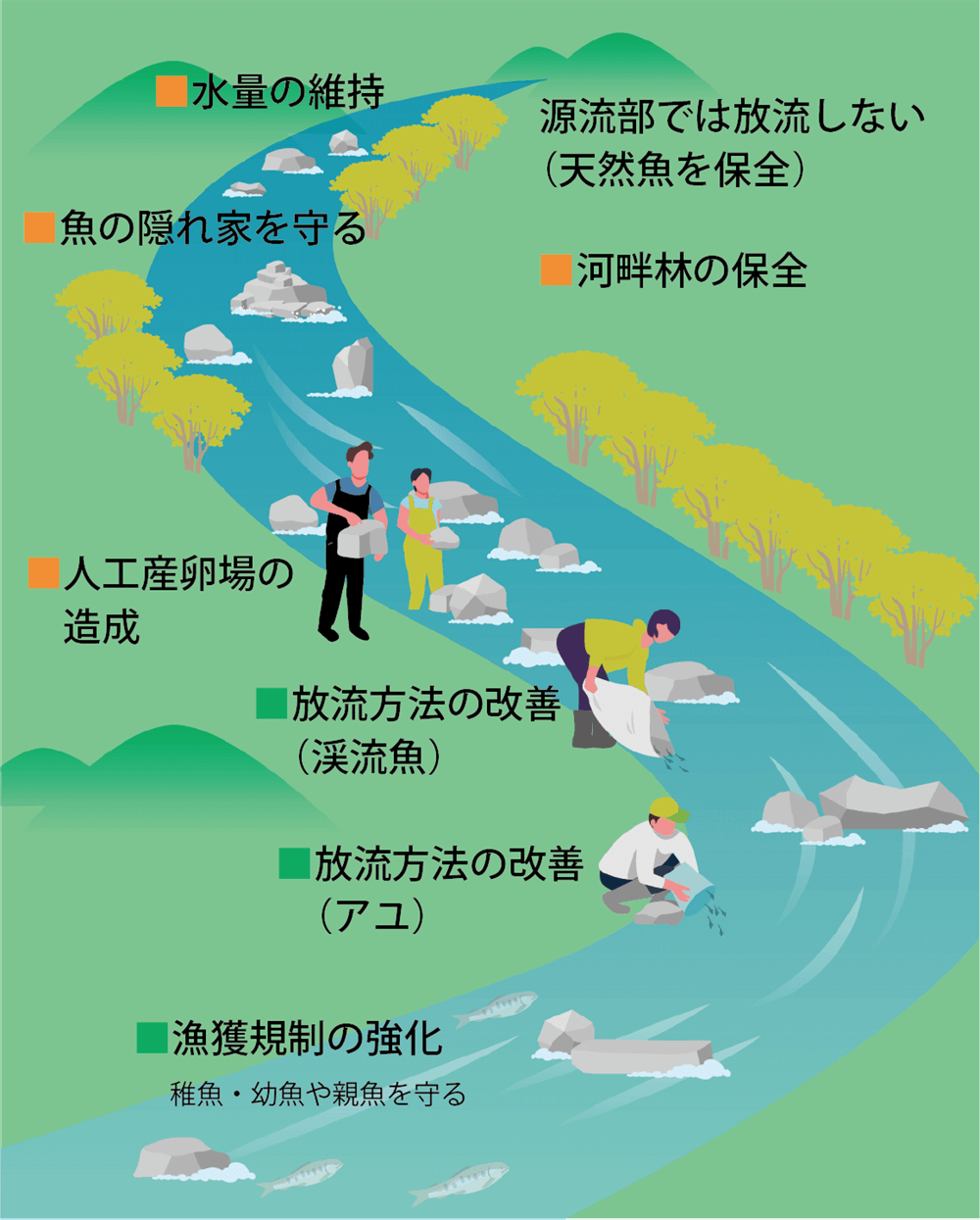 最近の研究で、放流の増殖効果が期待より低いことがわかってきた。放流をするだけでなく、稚魚・幼魚を守ったり、その年に産卵する親魚を守るための漁獲規制(体長制限や尾数制限、禁漁期など)を強化するのが良い。
