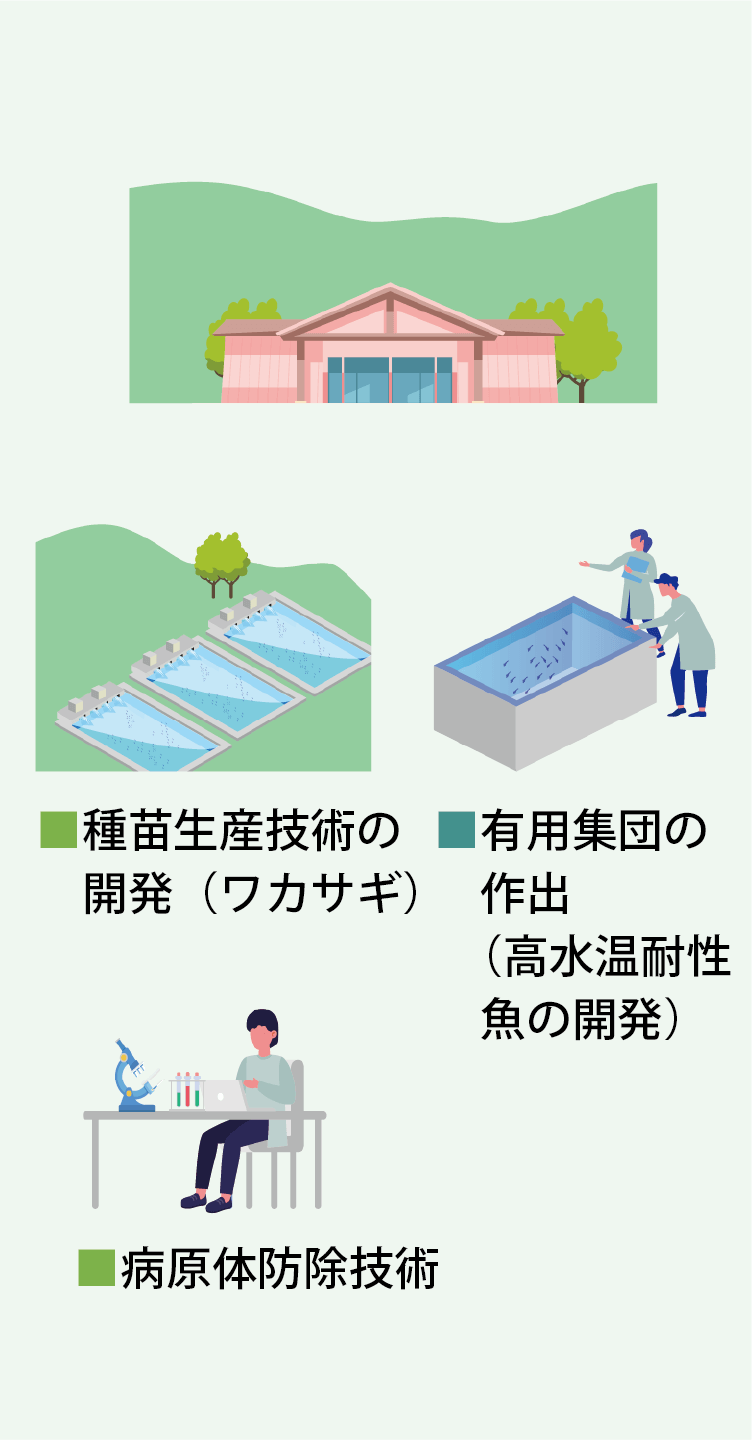 高水温に由来する疾病の発生などに関する情報を収集する。また、水温上昇により被害の拡大が予測される内水面魚類の疾病(アユのエドワジエラ・イクタルリ感染症など)について、病原体の特性や発症要因に関する研究とその結果を利用した防除対策技術の開発を行う。