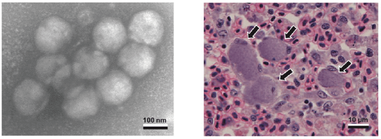イリドウイルス(左)とイリドウイルスに感染して肥大化したマダイの脾臓の細胞(右)