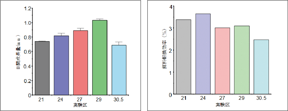 日間成長量と水温の関係    餌料転換効率と水温の関係