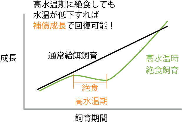 魚類では絶食(餌止め)後に再給餌すると成長速度が急激に速くなる補償成長という現象が知られている。高水温期が短期間ならば給餌量を減少させ代謝を抑制し、水温低下後に給餌を通常飼育に戻すと成長量は回復させられることがある。