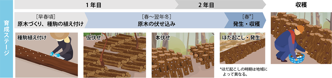 ヒポクレア属菌による被害報告は、人工ほだ場か林内での伏せ込みを行っている場所に限られ、裸地伏せの現場では大規模な被害報告が無い。仮伏せの期間や方法にも今まで以上に注意が必要となる。