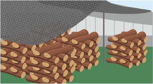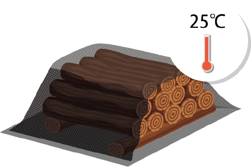 仮伏せを行っている生産現場では、仮伏せの方法や時期に注意が必要。特にビニールシートなどを利用して仮伏せを行う場合、急激に温度が上昇することがあるため注意が必要。高温環境下でシイタケ菌の抵抗力が下がることが確認されているため、最高温度計で温度を計測しながら内部温度が25℃を超えてきたら仮伏せを終了する。