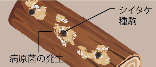 病虫害対策としては、まったく被害を発生させないというよりも、大発生にまで移行させないということが重要。そのためには、できるだけ早期に発見し、感染したほだ木や子実体を栽培現場から除去し、新たな感染源としないことが重要。感染したほだ木の除去は大変な作業になることから、被害ほだ木が数本程度のレベルの時に実施する必要がある。