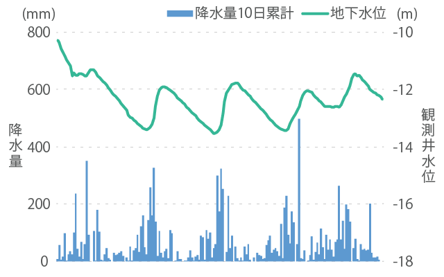 日降水量や降水の時間推移の変化による地下水位の変動、無降雨日数の増加等に伴う渇水の頻発による過剰な地下水採取の結果としての地盤沈下の進行、海面水位の上昇による地下水の塩水化などの可能性がある。