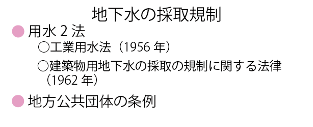 地盤沈下、塩水化、地下水汚染などの地下水障害の防止や生態系の保全等を確保しつつ、地域の地下水を守り、水資源等として利用する「持続可能な地下水の保全と利用」を推進する(閣議決定 2020より引用) 。