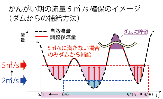かんがい期に地下水の涵養量より利用量が多くなることにより地下水位が低下して塩水化が懸念される場合に、ダムから放流を行って河川の流量を維持して涵養量(地下への浸透量)を確保すると共に、地下水利用量を抑制し、塩水化の防止が可能になると考えられる(西条市)。