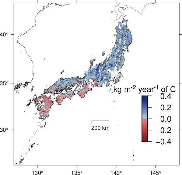 現在(1996-2000年)から将来(2096-2100年)にかけて年平均気温が約2.5℃上昇した場合、全国的にみると、スギ人工林の純一次生産量は増加すると予測されている。しかし、四国地方や九州地方など西日本を中心とする一部地域では、純一次生産量が低下すると予測されている(右図参照)。