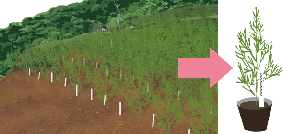 高温や乾燥ストレスに耐性を有するスギの品種改良を推進するために必要となる育種技術の開発や育種素材の作出等が進められている。