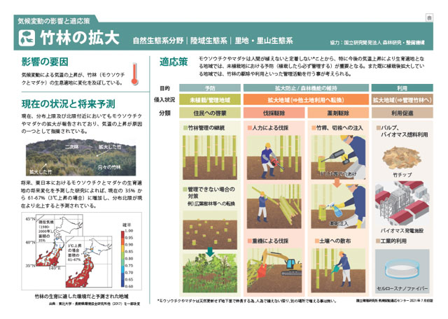 気候変動が進むと北日本でも竹林の生育適地が拡大すると予測されているが、竹林を植栽するのは管理出来る場合のみとする必要がある。管理できなくなった場合は放置せず、既に蓄積された知見を活かして竹林の地上部・地下部全てを駆除し、他の土地利用に転換する事が重要である。
