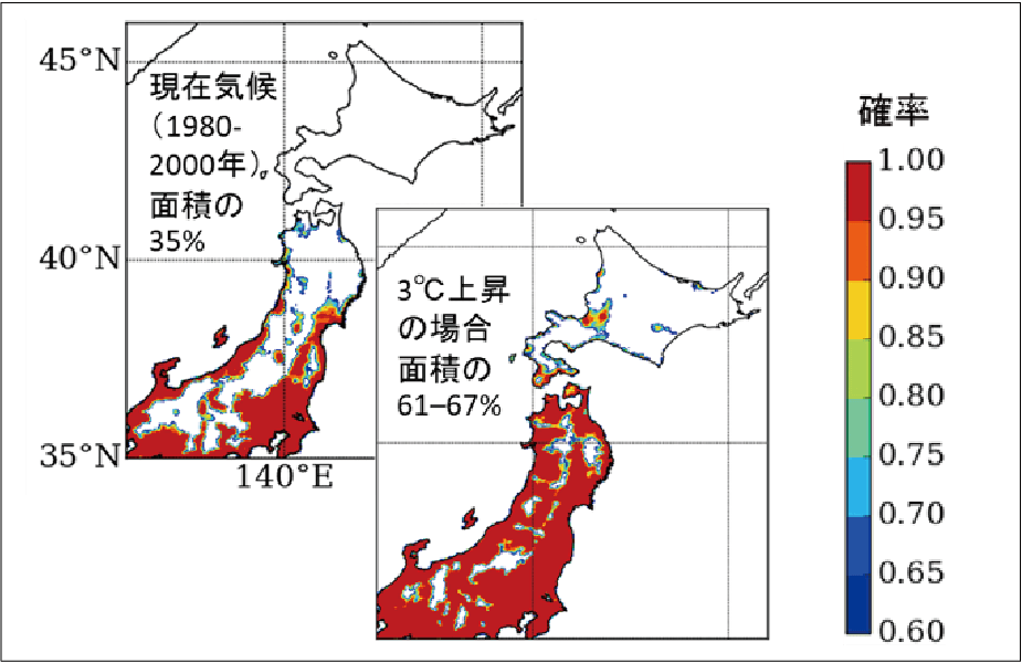 気候変動による気温の上昇が、竹林(モウソウチクとマダケ)の生息適地に変化を及ぼしている。