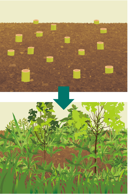 地上部の刈り払いを年2回7年間継続する(出典:森林総研 2018)。