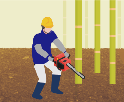 ナタや鋸を使う方法もあるが、竹用チェーンソー(木を切るチェーンソーより刃が多くついている)を使うと効率的である。
