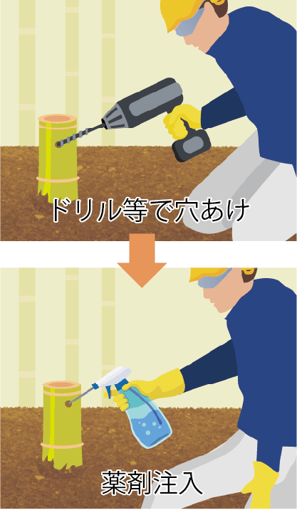 竹の枯殺を目的として農薬登録されている除草剤*には、グリホサート系除草剤と塩素酸系除草剤があり、竹稈または切り株に1本づつ注入する方法と、土壌に散布する方法がある。