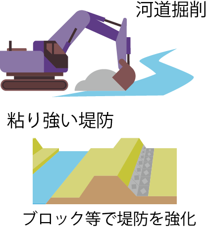 氾濫水を減らす為に、河川管理者による粘り強い堤防(越流しても決壊しにくい堤防)整備、河道掘削や引堤等、従来からの取組の更なる強化が進められている。