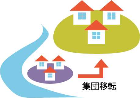 既に水災害リスクの高い地域では、防災・減災対策を実施したとしても一定のリスクが残る場合や、移転等の取組を促進する方が適切な場合も想定される為、防災集団移転促進事業やがけ地近接等危険住宅移転事業の活用などを活用し、当該地域からの移転も選択肢の一つとして検討する事が考えられる。