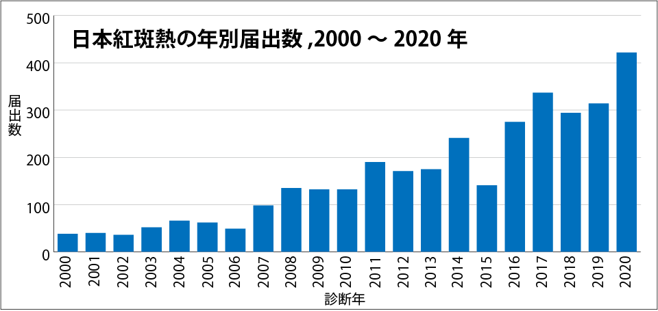 ②ツツガムシ:従来の標準3型Gilliam、Karp、Katoでは検出されないShimokoshi株等によるつつが虫病が確認され、届出数も増加傾向となり、診断法や疫学情報も新たな局面を迎え、古くて新しい感染症としての認識が必要(馬原2017より引用)となってきており注意が必要である。