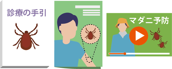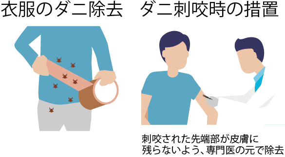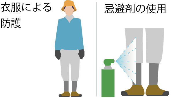 野外イベント等での人へのマダニリスク低減策として、場所を限定して医薬品医療機器等法で承認された衛生害虫用殺ダニ剤の散布の有効性が試験で確認されている(橋本ら2015, 2017)。主催者による殺ダニ剤散布の検討と参加者個人による予防(最右列参照)の併用等の対策が考えられる。