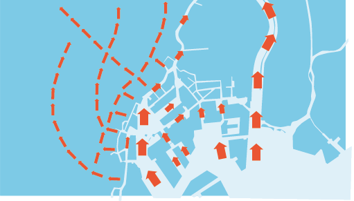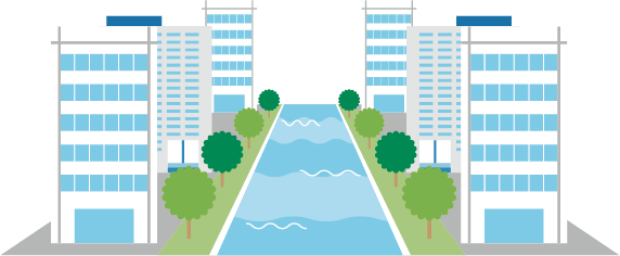 連続したオープンスペース(開放的な空間)を確保し、都市を流れる風を活用する。