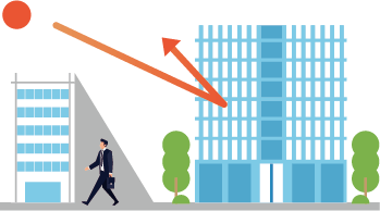 建物(オフィスビル、商業施設等)の窓や壁面に当たる日射の一部を上空に反射させ、地上の歩行者への反射日射を抑制する。窓面に適用する透明なフィルムの他、外壁用タイルが開発されている。(環境省2018)冬季の日射も反射され、暖房需要が増える為、目的(夏季の暑熱対策重視等)に応じて施行する事が考えられる。