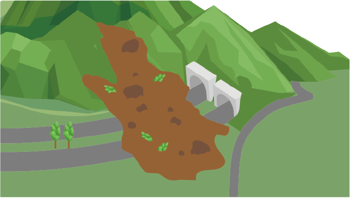 法枠工(崩落しそうな斜面をコンクリート製の枠で固定して崩落を防ぐ)や、法枠工とアンカー工の併用(コンクリート構造物と併せて、アンカーの設置により補強する)工法がある(国土交通省 参照2020年11月25日)。