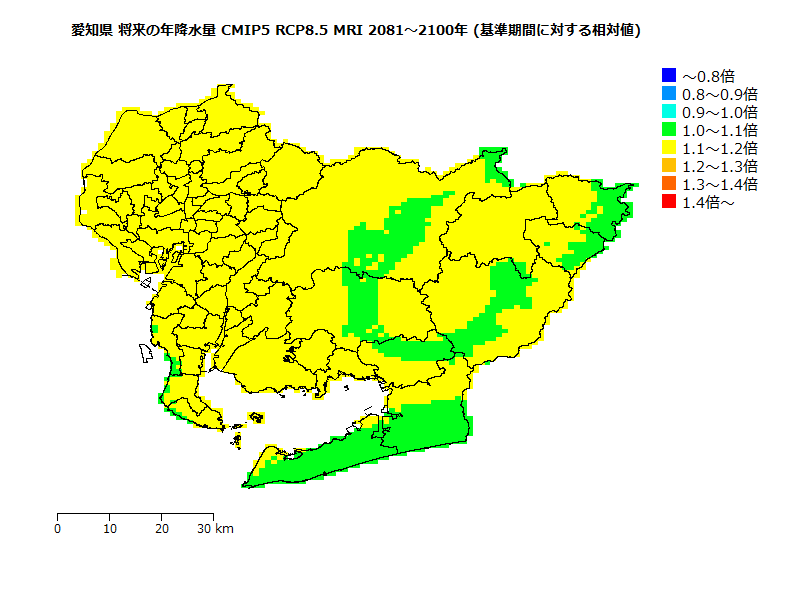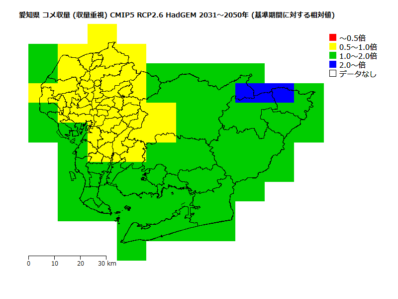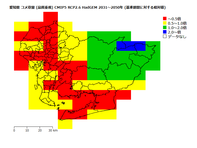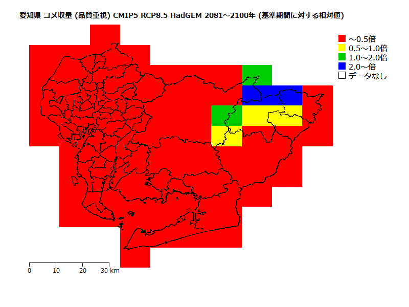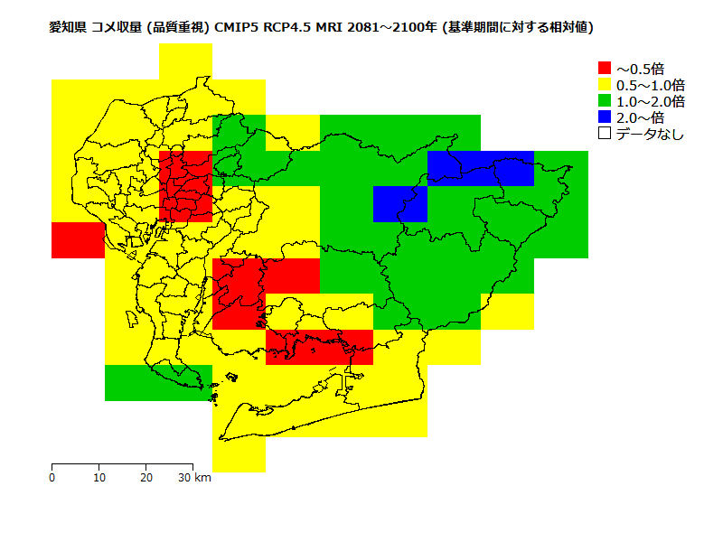 高温に因る品質低下リスクが「低」(品種: あいちのかおり )の収量の将来予測。 基準期間の高温に因る品質低下リスクが「低」の収量を1とした場合の相対値。