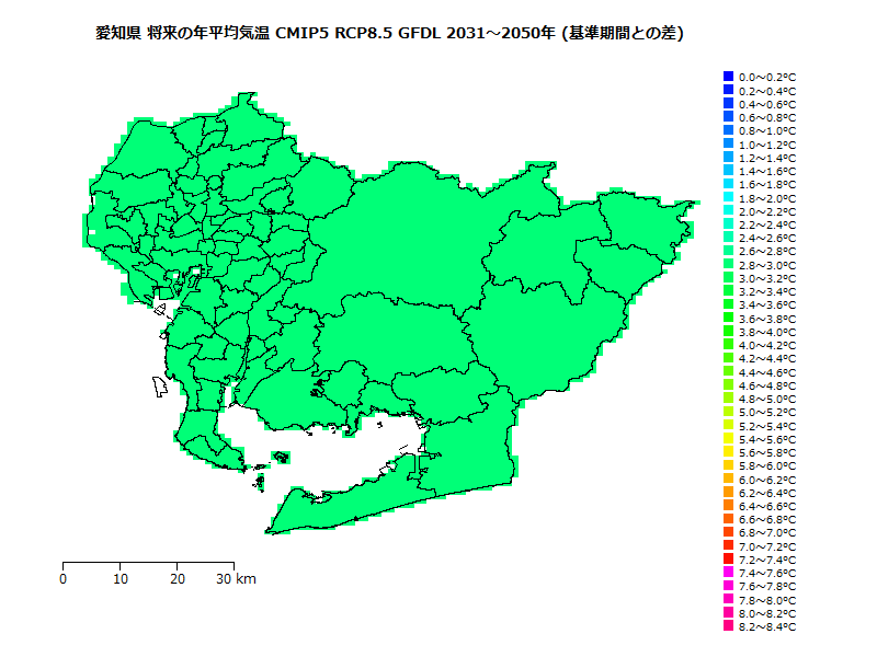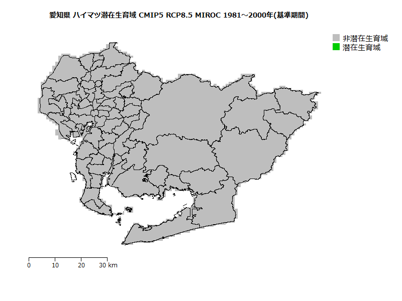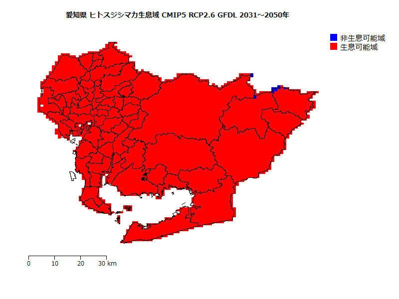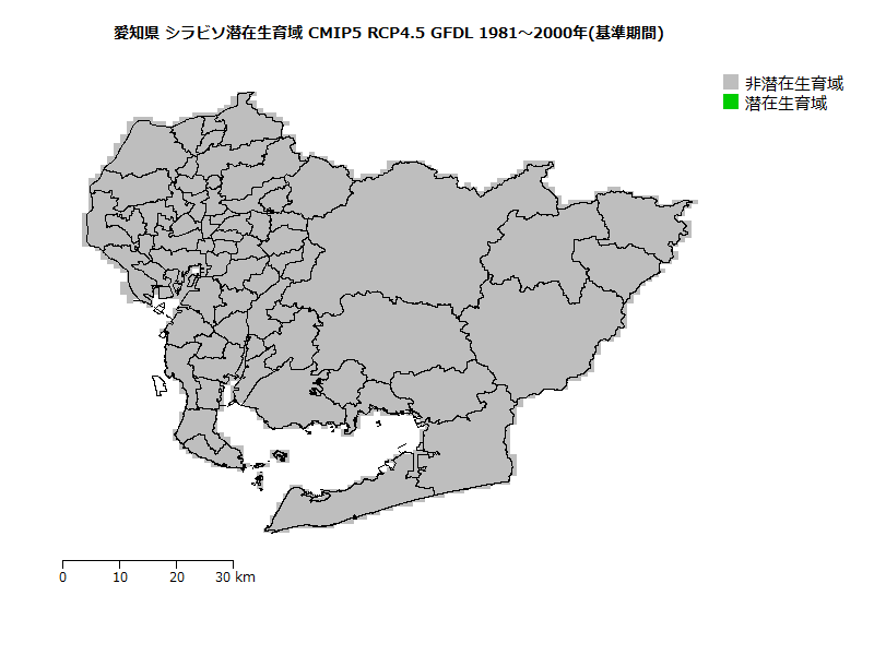 ヒトスジシマカの生息域の将来予測(基準期間に対する相対値)