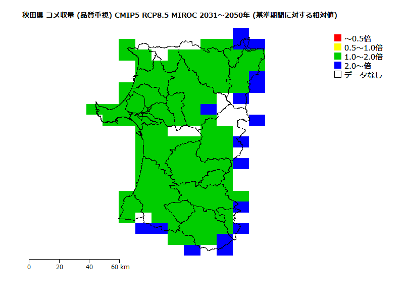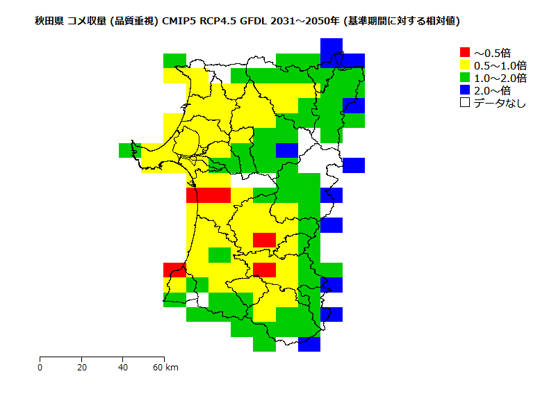 高温に因る品質低下リスクが「低」(品種: あきたこまち )の収量の将来予測。 基準期間の高温に因る品質低下リスクが「低」の収量を1とした場合の相対値。