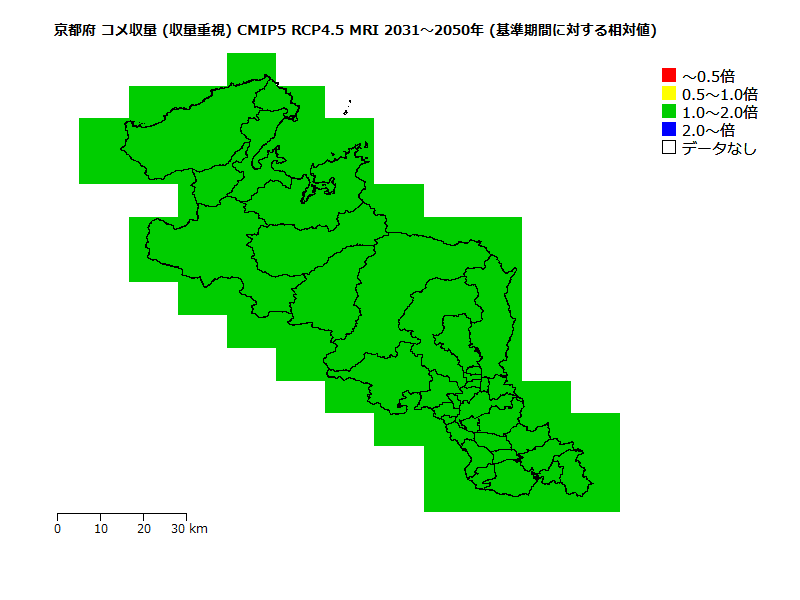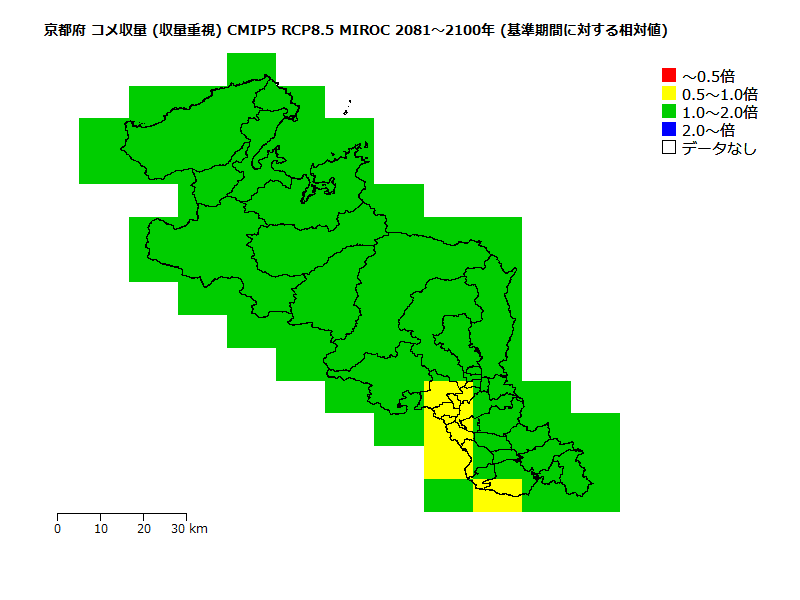 高温に因る品質低下リスクが「低」(品種: コシヒカリ )の収量の将来予測。 基準期間の高温に因る品質低下リスクが「低」の収量を1とした場合の相対値。
