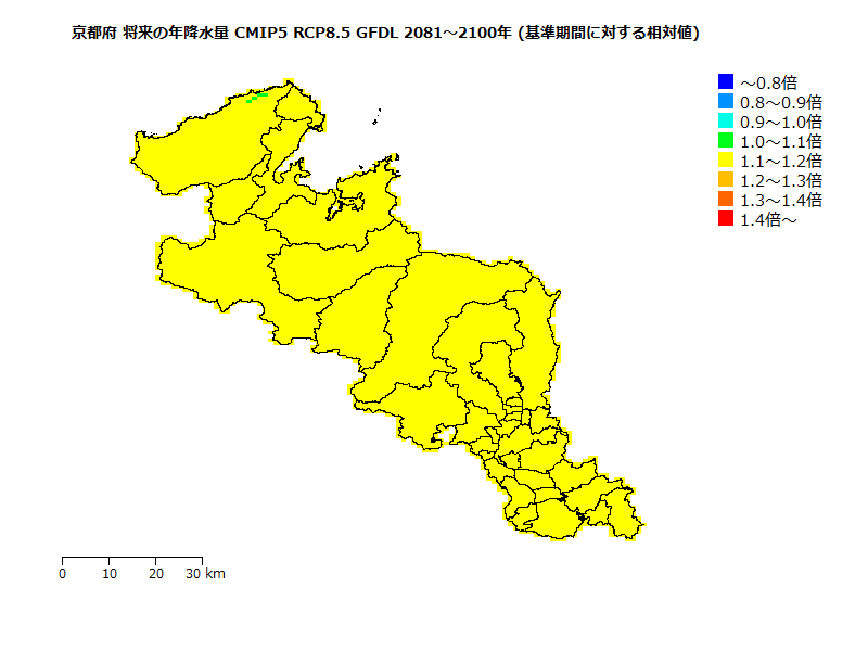 ヒトスジシマカの生息域の将来予測(基準期間に対する相対値)
