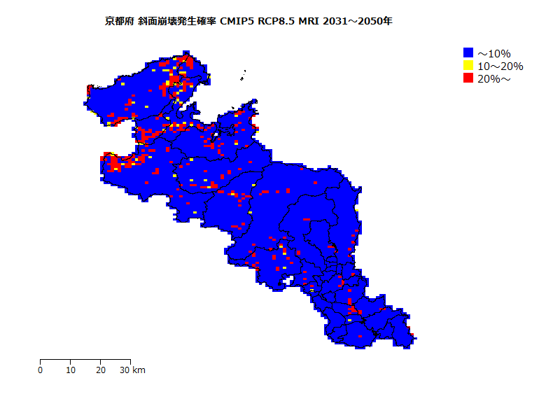 降水量や地盤情報より斜面崩壊発生確率を推計するモデルを作成し、このモデルを用いて将来の日降水量(年最大日降水量)における斜面崩壊発生確率を算定。