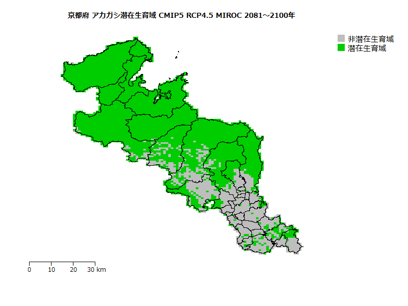気候要因を含む環境要因から統計的に予測するモデル(分布予測モデル)を用いて潜在生育域を評価。