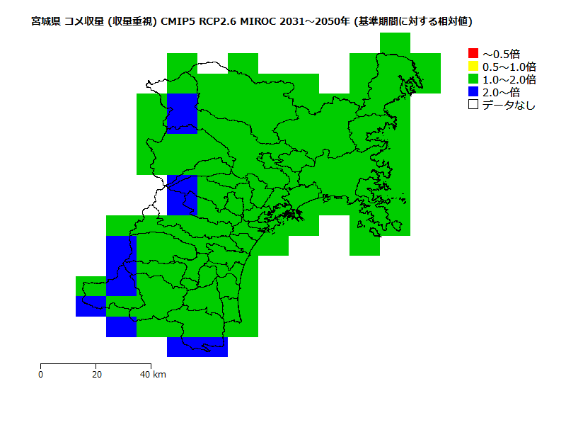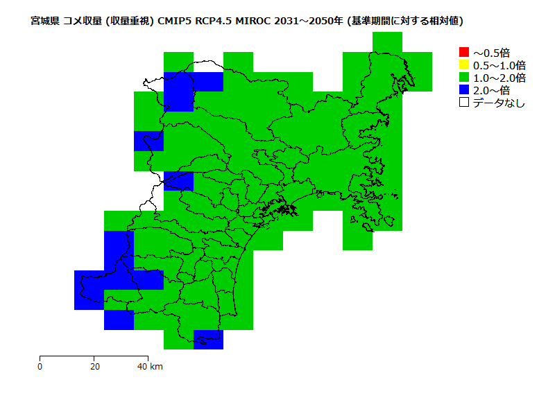 高温に因る品質低下リスクが「低」(品種: ひとめぼれ )の収量の将来予測。 基準期間の高温に因る品質低下リスクが「低」の収量を1とした場合の相対値。