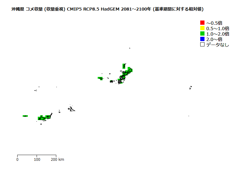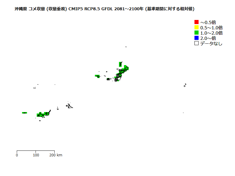 )の収量の将来予測。 基準期間の高温に因る品質低下リスクが「低」の収量を1とした場合の相対値。