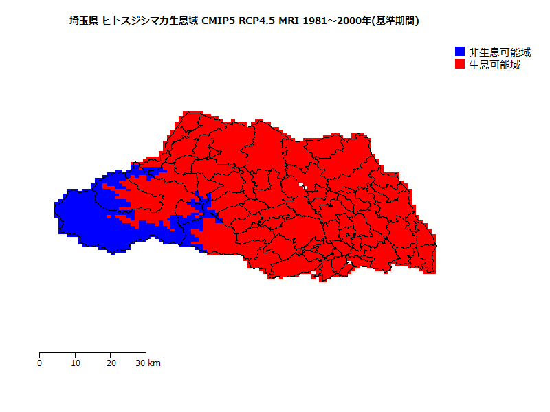 ヒトスジシマカの生息域の将来予測(基準期間に対する相対値)