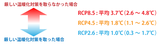 将来の気候予測は、私たちがこれから温室効果ガスの排出をどれくらい削減できるかという仮定(排出シナリオ)によって大きく変わります。ここでは、IPCC第5次評価報告書で用いられたRCPシナリオ*を用いています。
