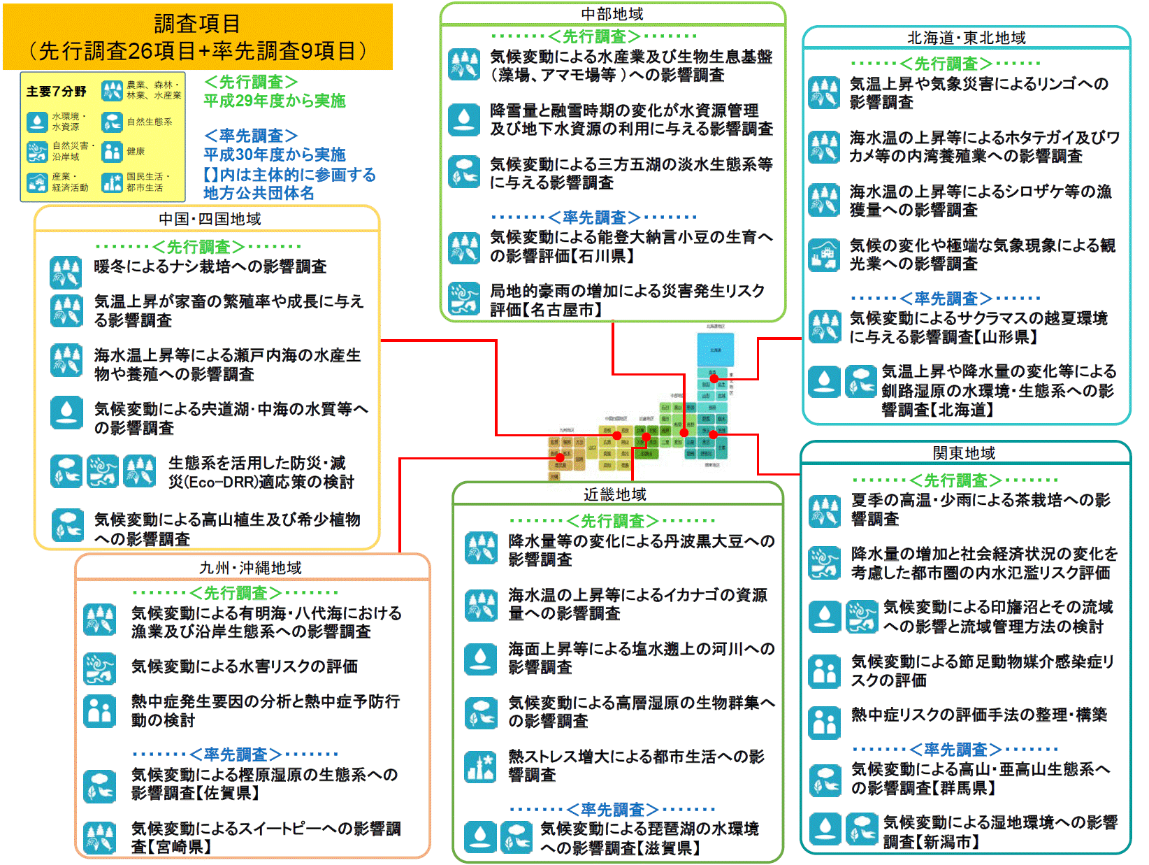 平成29年度から3カ年の予定で、農業、水産業、自然災害、自然生態系などの様々な分野において、「地域における気候変動影響に関する先行的調査(以下「先行調査」という。)」が26項目実施されました。