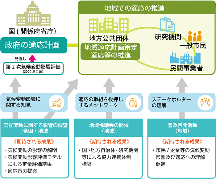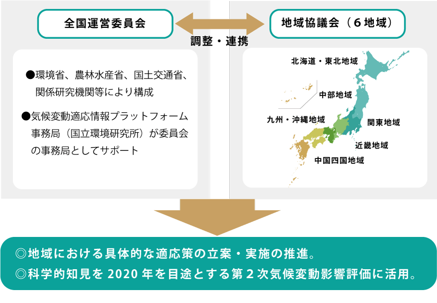 全国と6地域(北海道・東北、関東、中部、近畿、中国四国、九州・沖縄)にて、各地域のニーズに沿った気候変動影響に関する情報の収集・整理を行うとともに、地方公共団体、大学、研究機関など、地域の関係者との連携体制を構築し、気候変動による影響調査を実施することにより、具体的な適応策の検討が進められました。