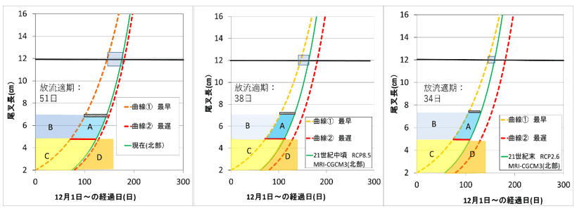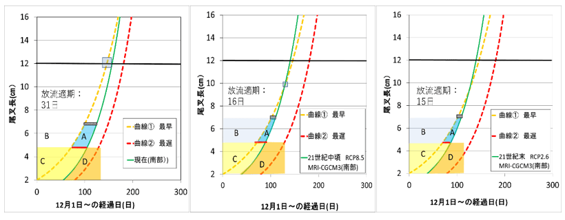 - 放流適期の将来予測を行った結果、21世紀末のRCP8.5のシナリオにおいては、放流適期が消滅する可能性のあることが示唆された。