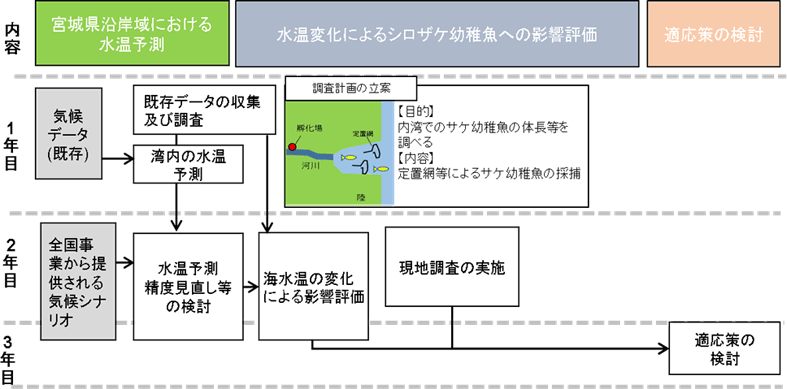 3ヶ年の実施スケジュールを図 3-2に示す。本調査の内容は、以下の3項目に大別される。第一に、サケと回帰率に関する既存知見の収集・整理を行い、調査計画策定・影響評価・適応策検討に必要となる、基本的な知見を取り纏めた。第二に、将来の水温データから予想される放流適期を求め、高水温の影響について評価分析を行った。第三に、サケの将来の高海水温環境に合わせたふ化放流事業を実施するために必要となる適応策について、影響評価や現地調査の結果に基づき検討を行った。