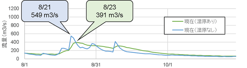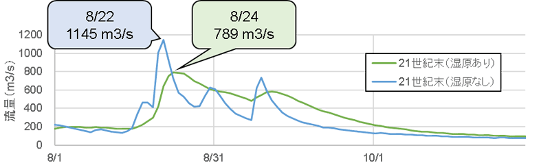 釧路湿原の保水機能を評価するために、釧路湿原自然再生事業において構築された水循環モデルを用いて、現在及び21世紀末(RCP8.5シナリオ)の大雨時における釧路川下流部(広里)でのピーク流量を、湿原がある場合とない場合とで比較した。現在の降水量としては、釧路湿原で大規模な出水が発生した2016年の観測日降水量を用いた。また、21世紀末の降水量は、2016年の観測日降水量に、現在から21世紀末への日降水量の変化率を乗じることで推計した。