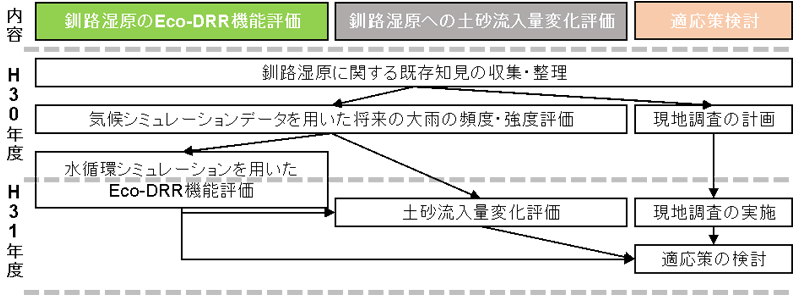 2ヶ年の実施スケジュールを図 6-2に示す。本調査の内容は、次の3項目に大別される。第一に、釧路湿原に関する既存知見の収集・整理を行い、調査計画策定・影響評価・適応策検討の参考とした。第二に、大雨の頻度・強度の増大に伴う釧路湿原への影響評価を実施した。具体的には、まず、気候シナリオデータを用いて、将来の大雨の頻度・強度を評価した。次に、将来の大雨を想定した釧路湿原の水循環シミュレーションを実施し、釧路湿原の持つEco-DRR機能を評価した。最後に、湿原内を流れる各河川の流量変化と、各河川のL-Q式(河川のある地点における、流量Qと流出負荷量Lとの関係式)から、各河川の土砂・栄養塩流入量の変化を評価した。第三に、釧路湿原の生物多様性やEco-DRR機能を維持・向上させる適応策を、影響評価や現地調査の結果に基づき検討した。