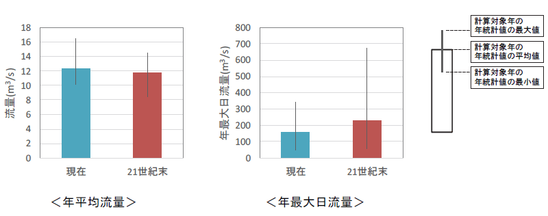 一方、日流量で見ると、最大値は将来の方が大きな値が発生すると予測された。これは、強雨の発生頻度の傾向と対応している。